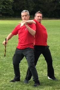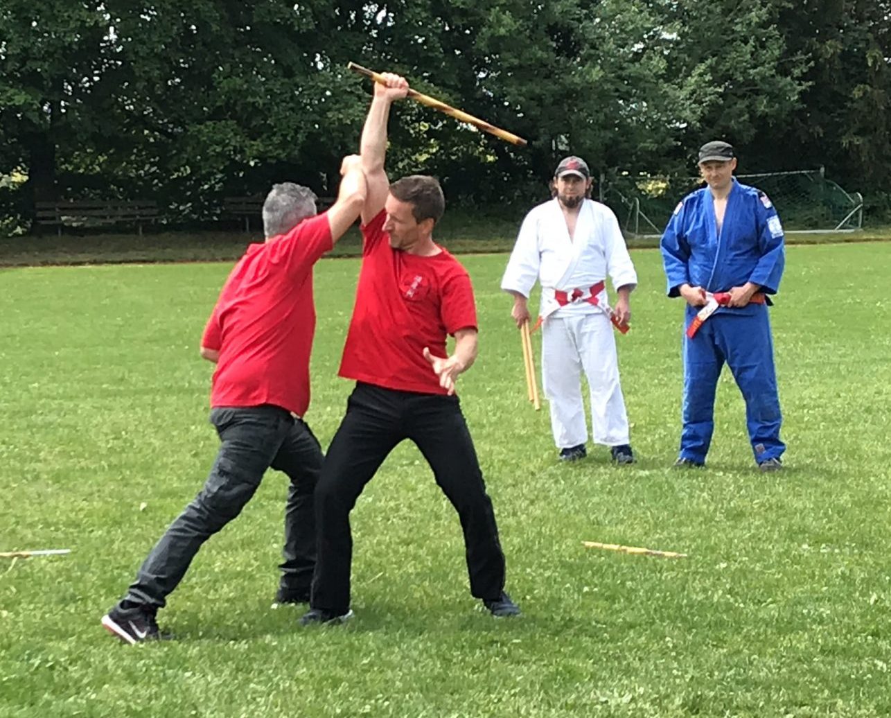 Shihan Matthias Weiss ,7. Dan, Landestrainer Hanbo Jitsu und Pressewart des IFAK, unterrichtete die Hanbo Jitsu Einheit. Hanbo Jitsu ist die Verteidigung mit dem Stock. Bei diesen Trainingseinheiten wurden unterschiedliche Einsatz- und Anwendungsmöglichkeiten trainiert. Beginnend mit der waffenlosen Verteidigung gegen einen Stockangriff. Nach erfolgreicher Abwehr und Entwaffnung des Angreifers wurde der Stock gegen den nächsten Stockangriff eingesetzt. Als weitere Folge zeigte Shihan Matthias Weiss dann noch jeweils eine Doppelstock-Verteidigung aus dem Modern Arnis, der Verteidigung mit 2 Stöcken.