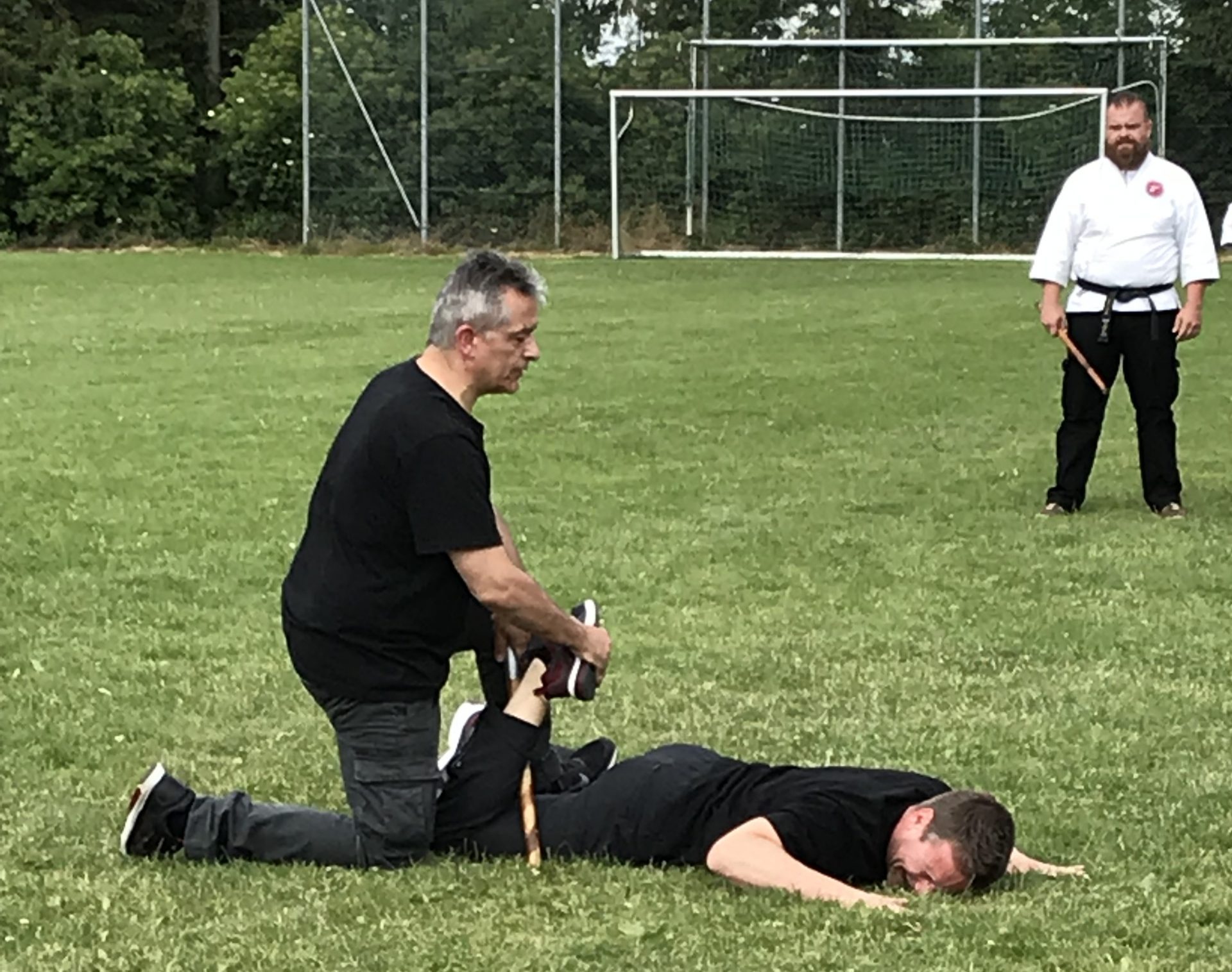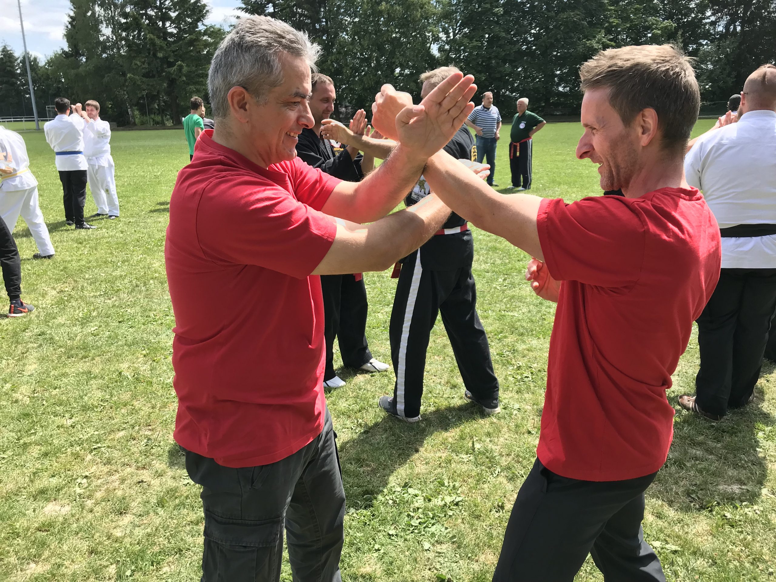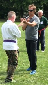 Shihan Kelly Sach, 7. Dan, übernahm die Einheit zum Thema Nervendruckpunkte. Das Wissen und die richtige Anwendung von Nervendruckpunkten können die Verteidigung und Abwehrtechniken sehr effektiv ergänzen und unterstützen. Hierbei ist in der Regel auch kein großer Kraftaufwand notwendig, so dass diese Nervendruckpunkte auch von weniger trainierten Personen angewandt werden können. Nachdem die Anwendung und Auswirkung unterschiedlicher Nervendruckpunkte trainiert wurden, zeigte Shihan Kelly Sach noch eine kleine Nervendruck-Kata, um die gelernten Punkte besser verinnerlichen zu können.